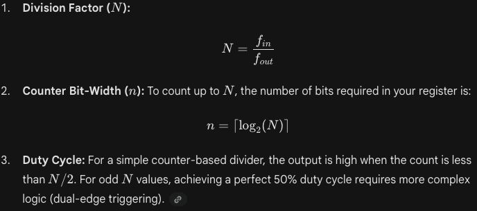 Odd Division: Dividing by an odd number (like 3 or 5) and maintaining a 50% duty cycle is tricky. It usually requires ORing or ANDing two clocks that are triggered on different edges (Rising and Falling).
