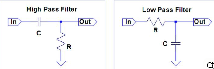 An RC filter consists of a resistor (R) and a capacitor (C). The configuration determines whether it is a Low Pass (passes DC, blocks high frequencies) or a High Pass (blocks DC, passes high frequencies).